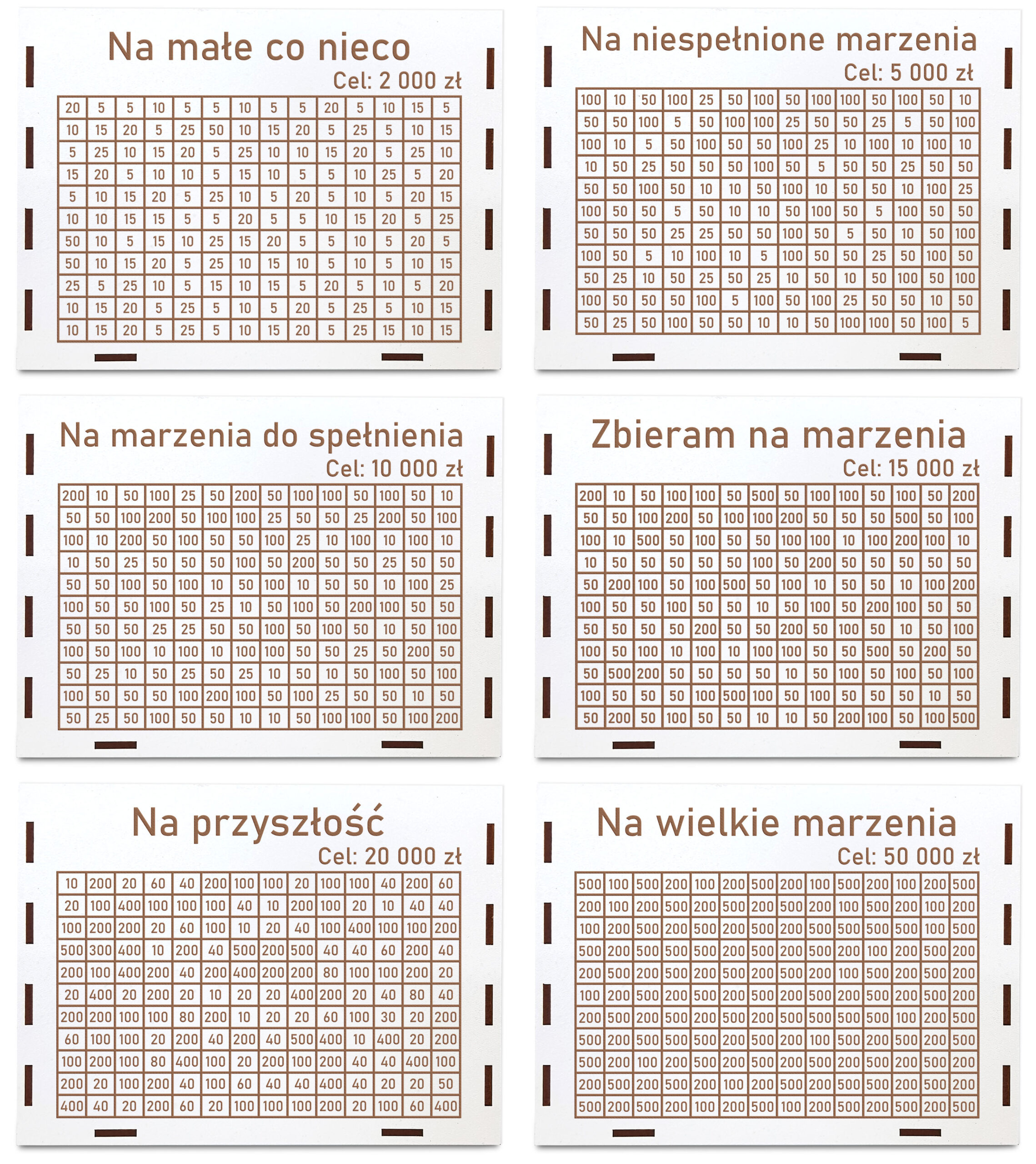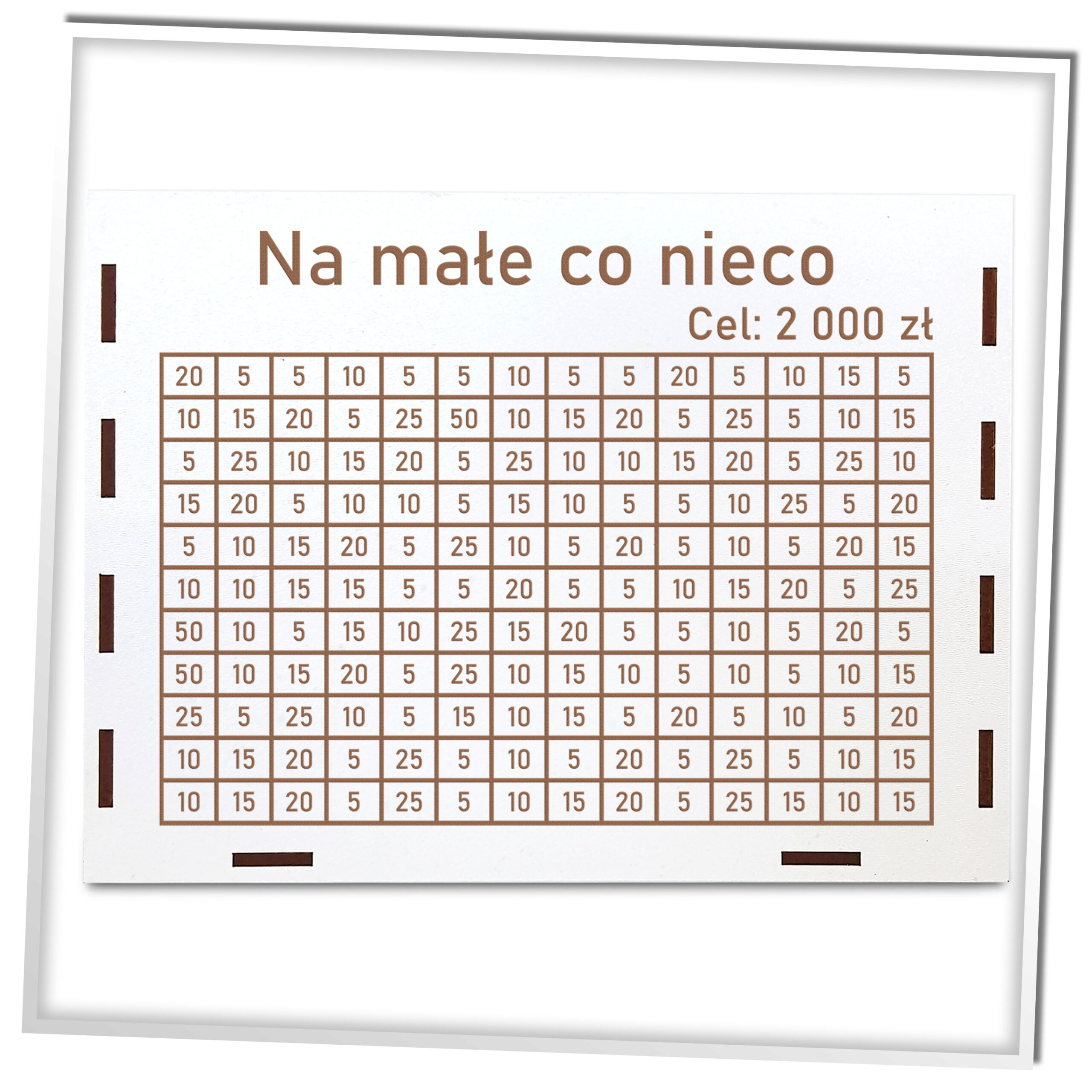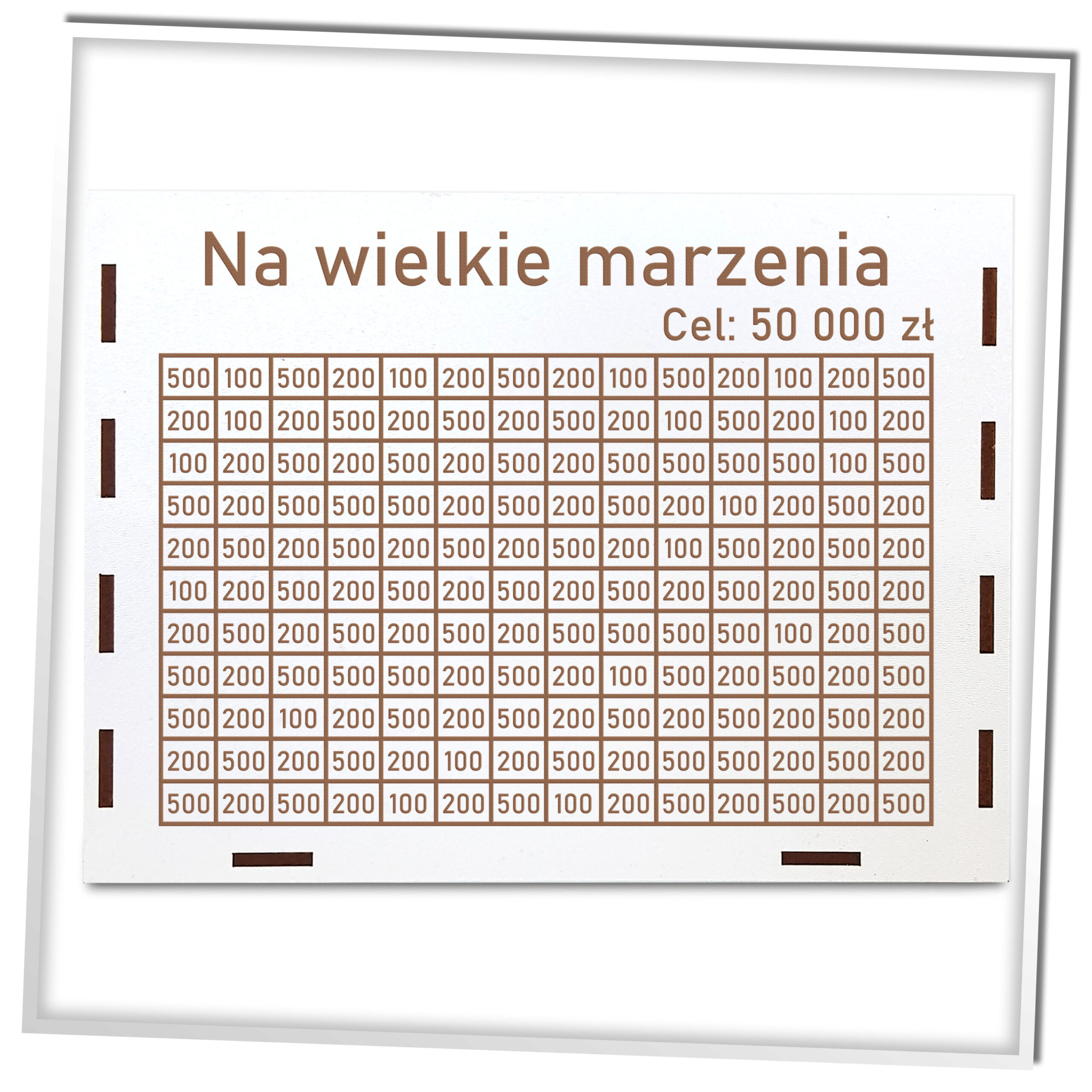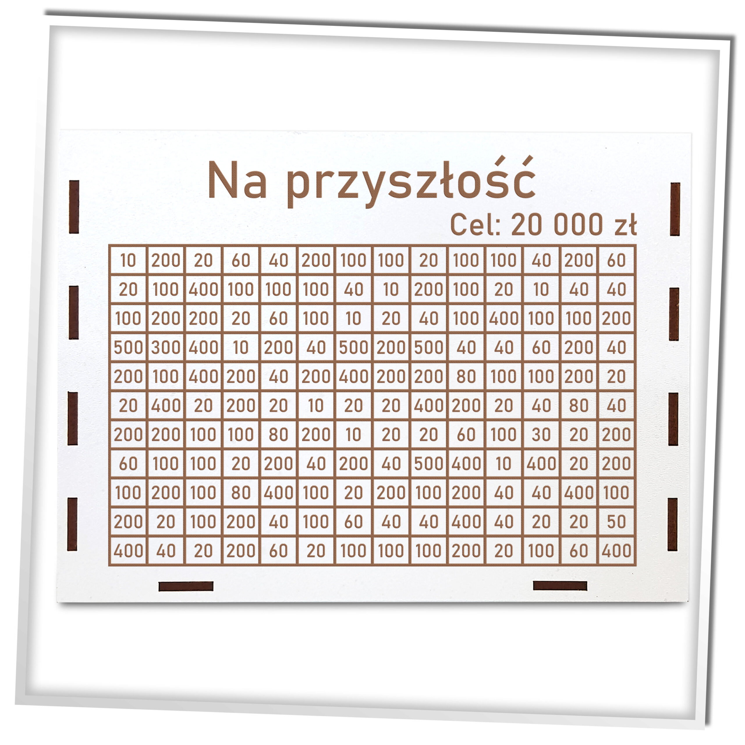 Skarbonka z wygrawerowaną tabelką do wykreślania to innowacyjne narzędzie do oszczędzania dostępne w trzech wariantach, dostosowanych do różnych celów finansowych: 5 000 zł, 10 000 zł oraz 15 000 zł.